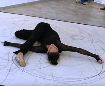 Interdisziplinäre Performance, die die Spuren der Tanzbewegung durch Grafit als Zeichnung sichtbvar werden lässt.